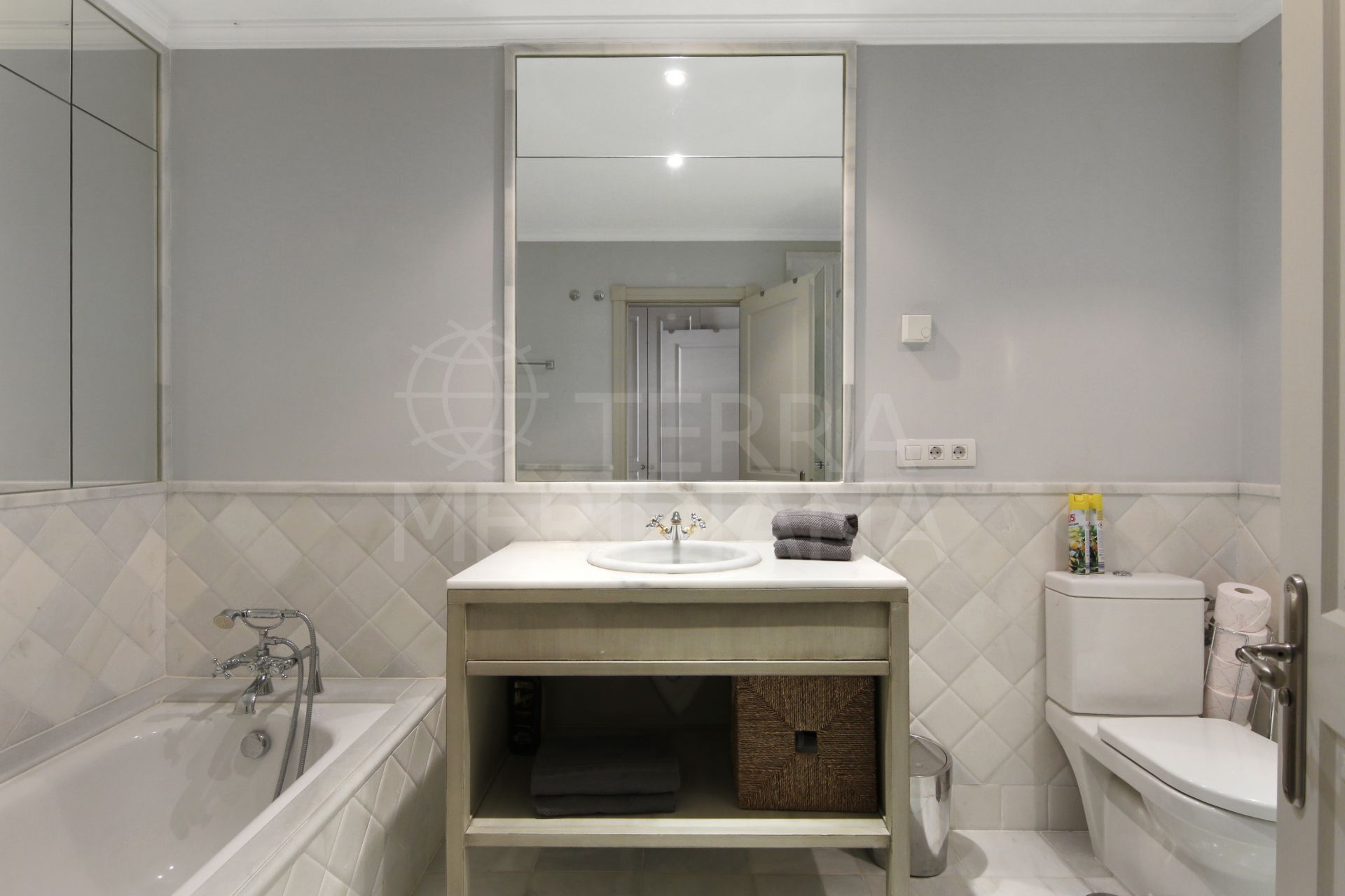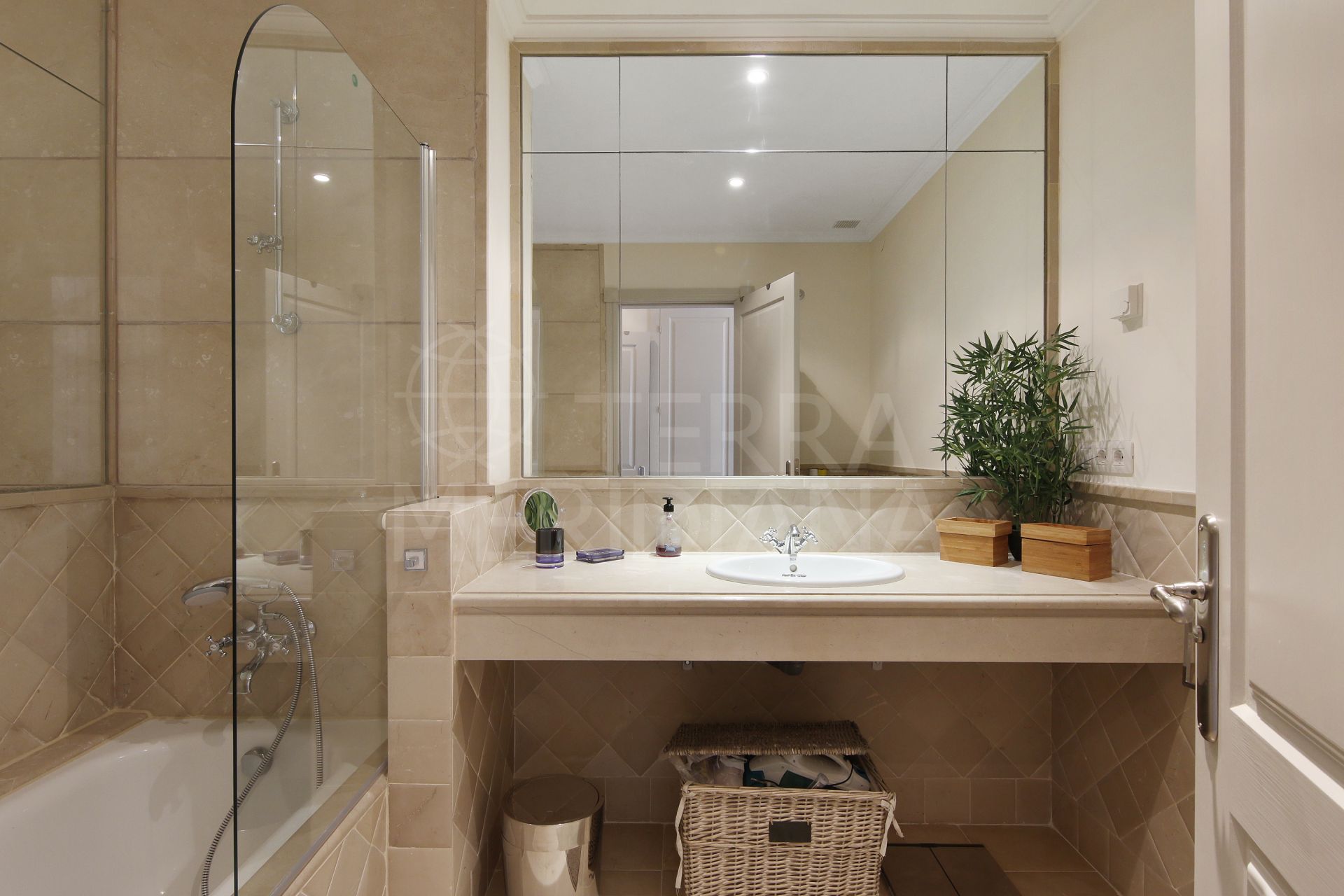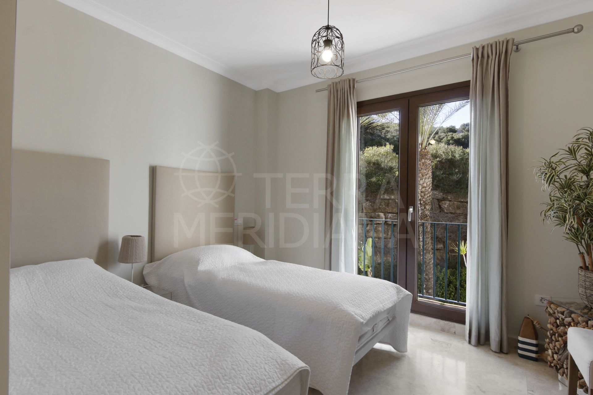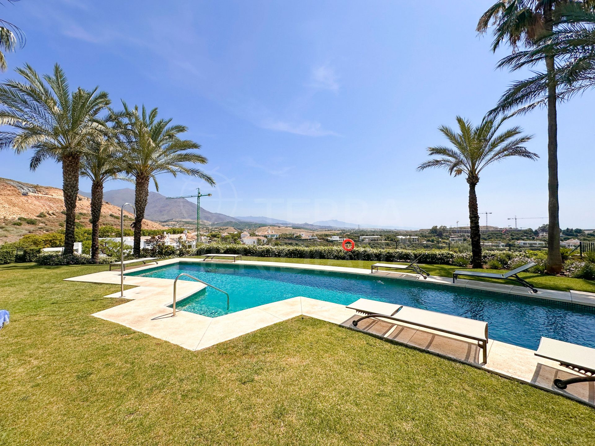 El apartamento cuenta con dos amplios dormitorios, ambos con baño en suite. La suite principal disfruta de acceso directo a los jardines y vistas al mar, proporcionando un refugio tranquilo y privado. El dormitorio de invitados también dispone de baño en suite y un balcón privado con vistas a los jardines comunitarios. Los acabados de alta calidad son evidentes en toda la vivienda, incluyendo ventanas de doble acristalamiento, suelos de mármol travertino y calefacción por suelo radiante en los baños. La propiedad se vende con una plaza de garaje subterránea y un trastero.