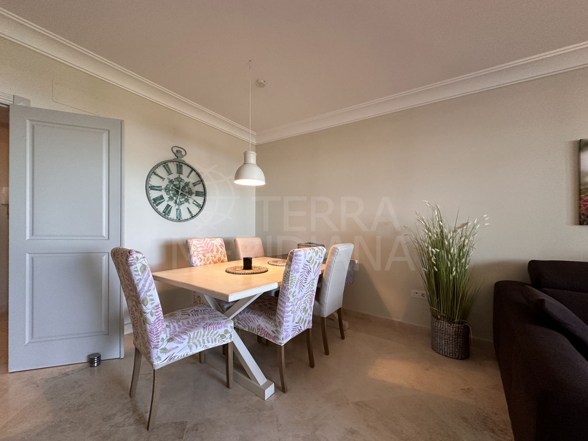 Este elegante apartamento en planta intermedia está idealmente ubicado dentro de la codiciada comunidad de Altos de Cortesín. Ofrece hermosas vistas al mar y una amplia terraza privada, combinando comodidad, amplitud y un entorno excepcional. El luminoso salón-comedor se abre directamente a la terraza, donde las vistas panorámicas al mar y al campo de golf crean un impresionante telón de fondo tanto para relajarse como para recibir invitados. Junto al vestíbulo de entrada, la moderna cocina totalmente equipada se complementa con un lavadero y cuarto de servicio independiente, aportando practicidad al día a día.