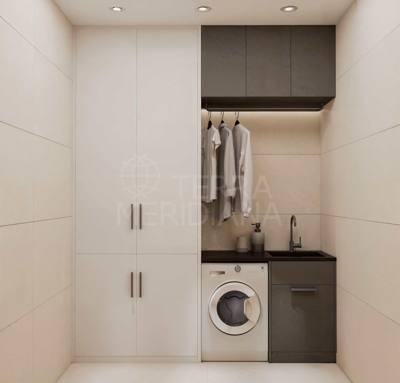 Los baños reflejan un estilo contemporáneo refinado, con revestimientos porcelánicos de suelo a techo, duchas minimalistas a ras de suelo, lavabos integrados, elegantes muebles de tocador y espejos retroiluminados que realzan tanto la funcionalidad como el diseño. La entrada principal da la bienvenida a los residentes con una distribución abierta y sofisticada, acentuada por una sutil iluminación LED, mientras que el espacioso garaje garantiza comodidad, practicidad y seguridad.