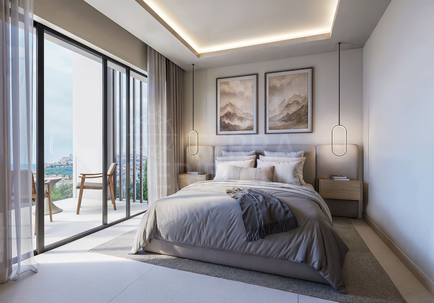 El salón, enmarcado por grandes ventanales con vistas al Mediterráneo, proporciona el escenario perfecto para momentos inolvidables, donde el diseño contemporáneo y los acabados premium se integran sin esfuerzo con la naturaleza. Los dormitorios están concebidos como santuarios privados de calma, con tonos suaves, generosas proporciones y abundante luz natural para favorecer el descanso y la relajación.