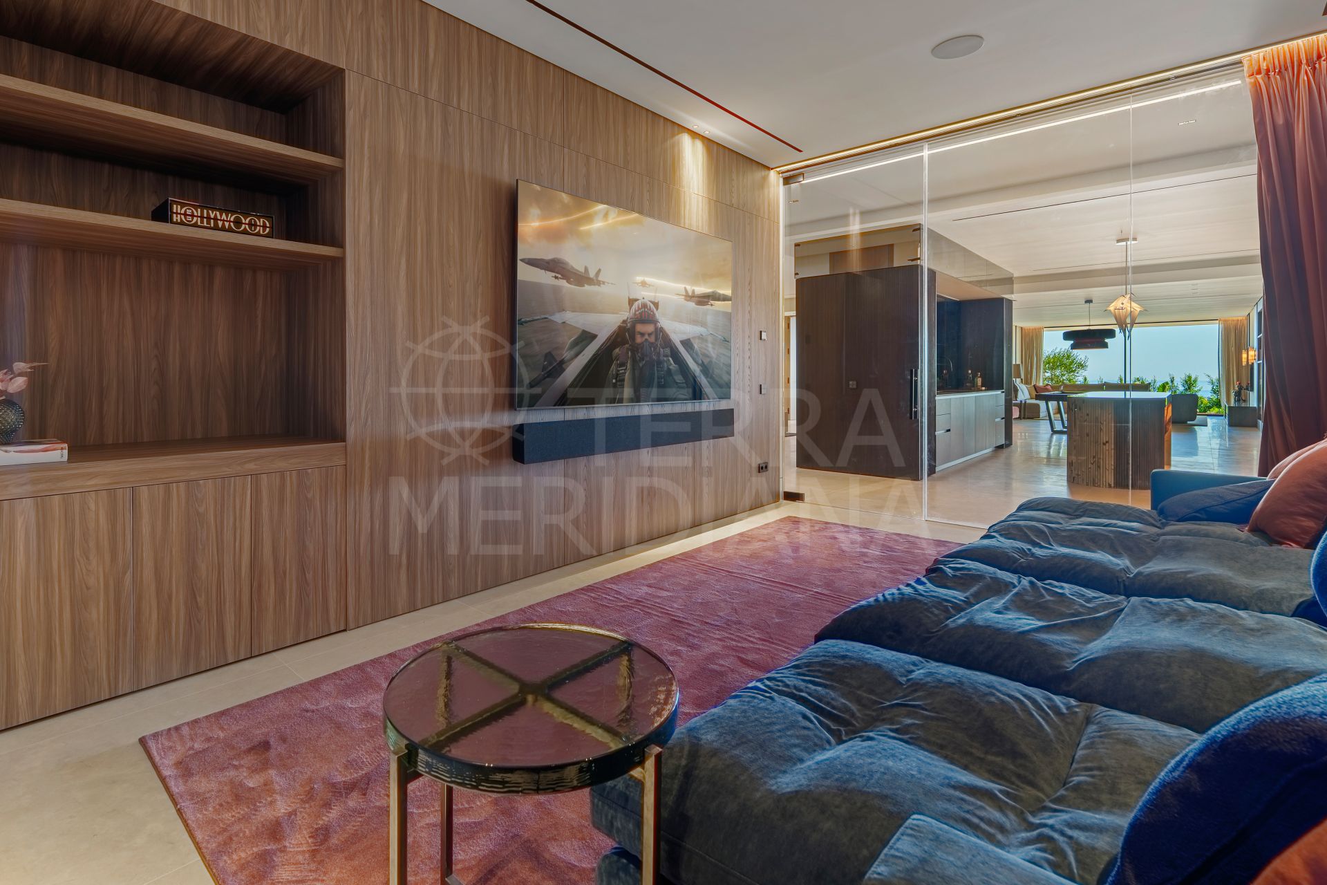 La planta inferior ofrece casi 800 m² de espacio habitable refinado, iluminado por grandes ventanales que continúan capturando el paisaje. Diseñada para el ocio y el bienestar, incluye varios salones de entretenimiento, sala de juegos, sala de cine, gimnasio totalmente equipado y un spa interior con piscina y jacuzzi. En este nivel también se encuentra una oficina, un garaje para ocho coches y tres dormitorios adicionales en suite, uno de ellos con entrada independiente y cocina, ideal para personal o invitados que busquen mayor independencia.
