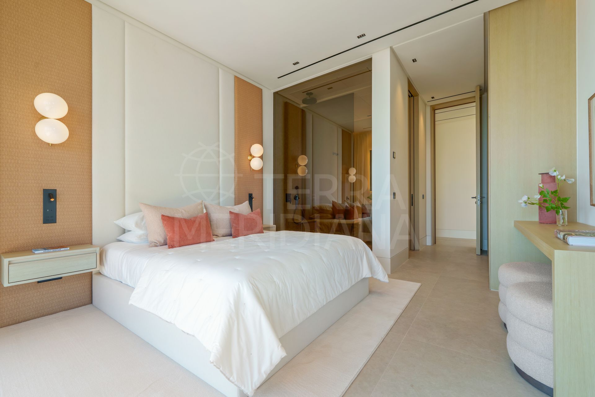 El vestíbulo de entrada está bañado por luz natural, realzada por grandes ventanales de suelo a techo que enmarcan vistas impresionantes. La zona principal de estar ha sido cuidadosamente diseñada para ofrecer confort y estilo. Una chimenea central separa sutilmente el elegante salón del generoso comedor y la cocina de diseño, creando espacios definidos sin perder la fluidez del concepto abierto. La cocina conecta directamente con una cocina exterior, ofreciendo una experiencia perfecta para cocinar y recibir invitados tanto en el interior como al aire libre. En este nivel también se encuentran dos elegantes dormitorios de invitados en suite.