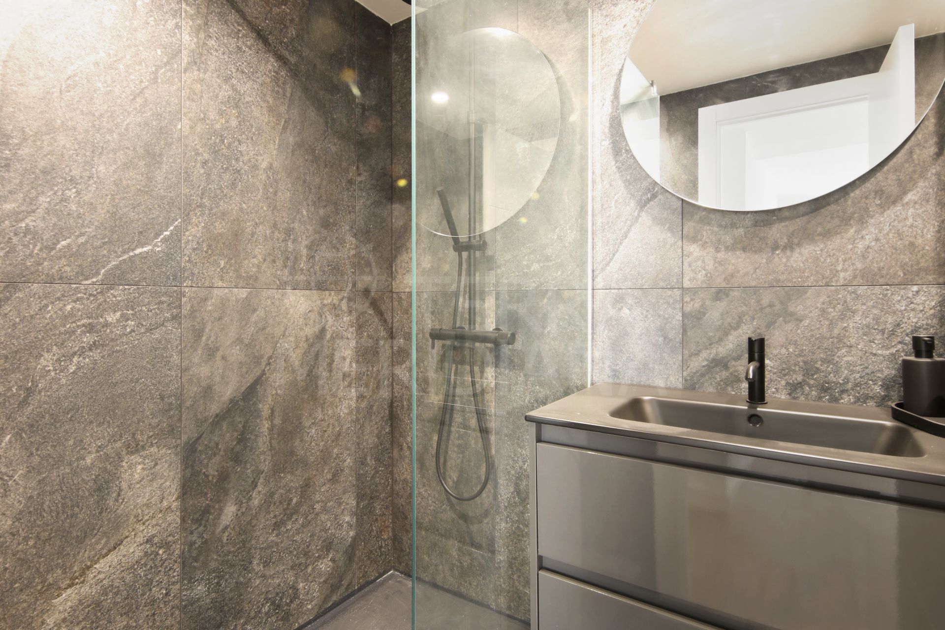 Un couloir mène de la pièce principale aux espaces nuit. La première chambre, de belle taille, est idéale pour des invités, des enfants ou même un bureau à domicile. À côté, vous trouverez une salle de bains complète et spacieuse, qui fait également office de toilettes pour les invités. Au bout du couloir se trouve la chambre principale, offrant intimité et confort. Ce vaste espace dispose de sa propre salle de bains attenante, créant un véritable havre de paix au sein de l’appartement. Les deux chambres, ainsi que le salon, bénéficient d’un accès direct à la terrasse, où vous pourrez vous détendre en surplombant la rue.