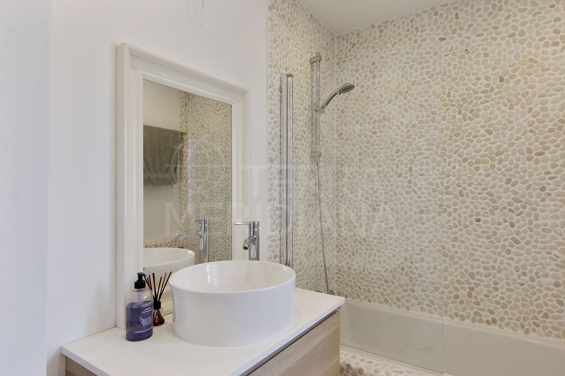 "Luxurious 2-bedroom ground-floor apartment near Estepona's beach, featuring renovated ensuite bedrooms and a private, pebble-finished garden with a plunge pool and direct community access to the shore."