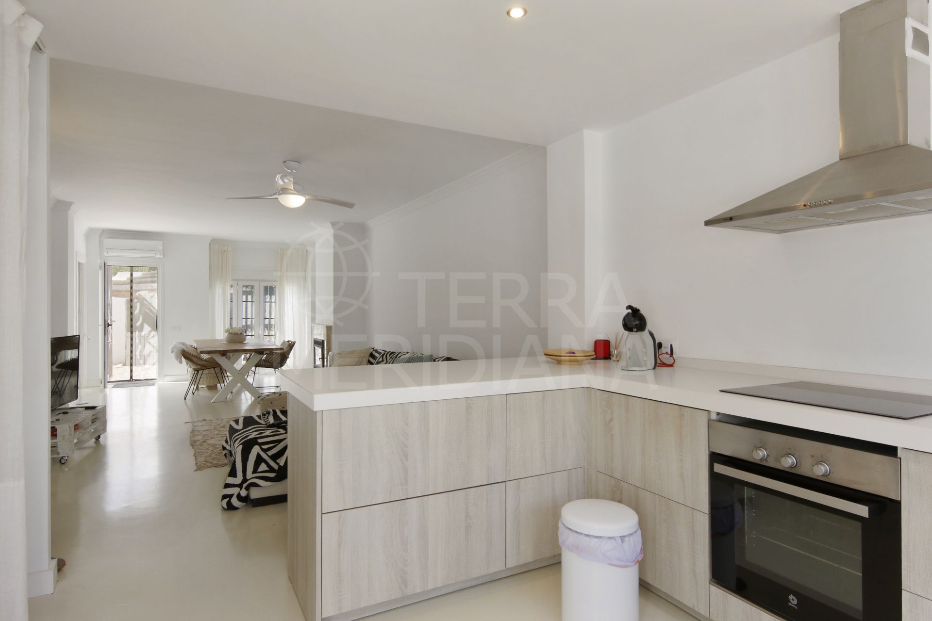 Discover this stunning 2-bedroom ground-floor apartment, located in a highly desirable, low-density residential area on the east side of Estepona. This established neighborhood offers a tranquil atmosphere just 250 meters from the beach.
