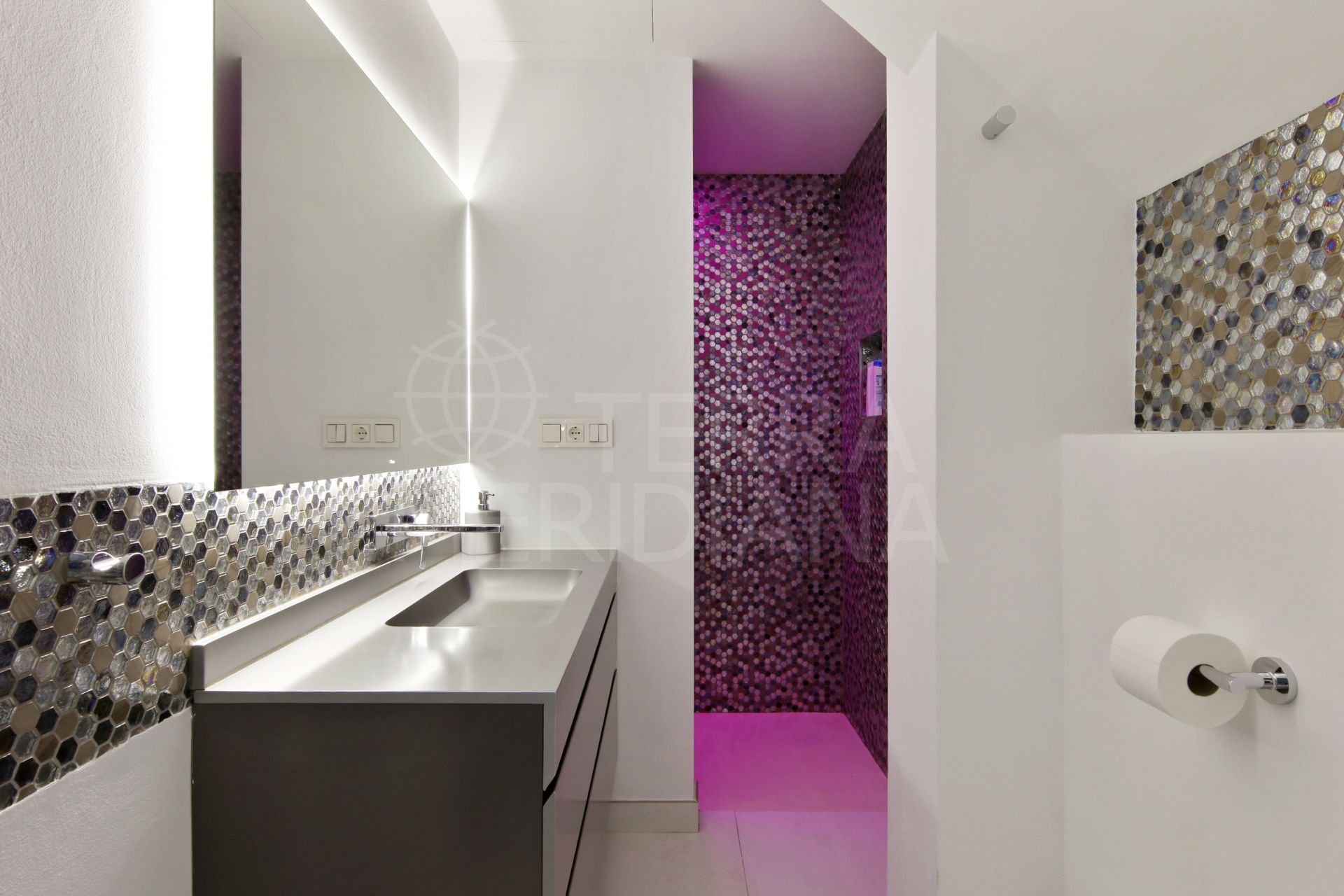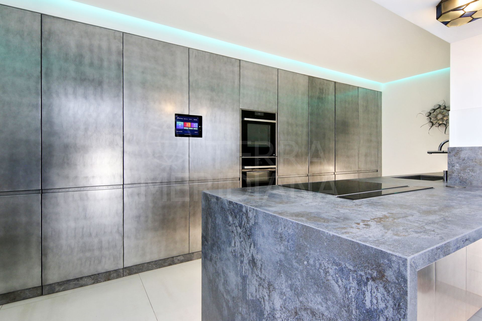 The layout has been thoughtfully designed across multiple levels. The entrance opens into a practical vestibule leading to the main bedroom floor, which includes three well-proportioned rooms. The master suite stands out with its luxurious bathroom and generous wardrobe space, while a second bedroom benefits from its own en-suite. The third bedroom is currently used as a home office, offering flexibility. Upstairs, the living areas are bright and inviting, with a sleek modern kitchen, integrated appliances, a discreet chef’s kitchen, and a hidden laundry area. The spacious living room and sitting area sit beneath a large retractable skylight, creating a seamless indoor–outdoor feel. A spiral staircase leads to two terraces, including a solarium with a summer kitchen and bar, ideal for entertaining.