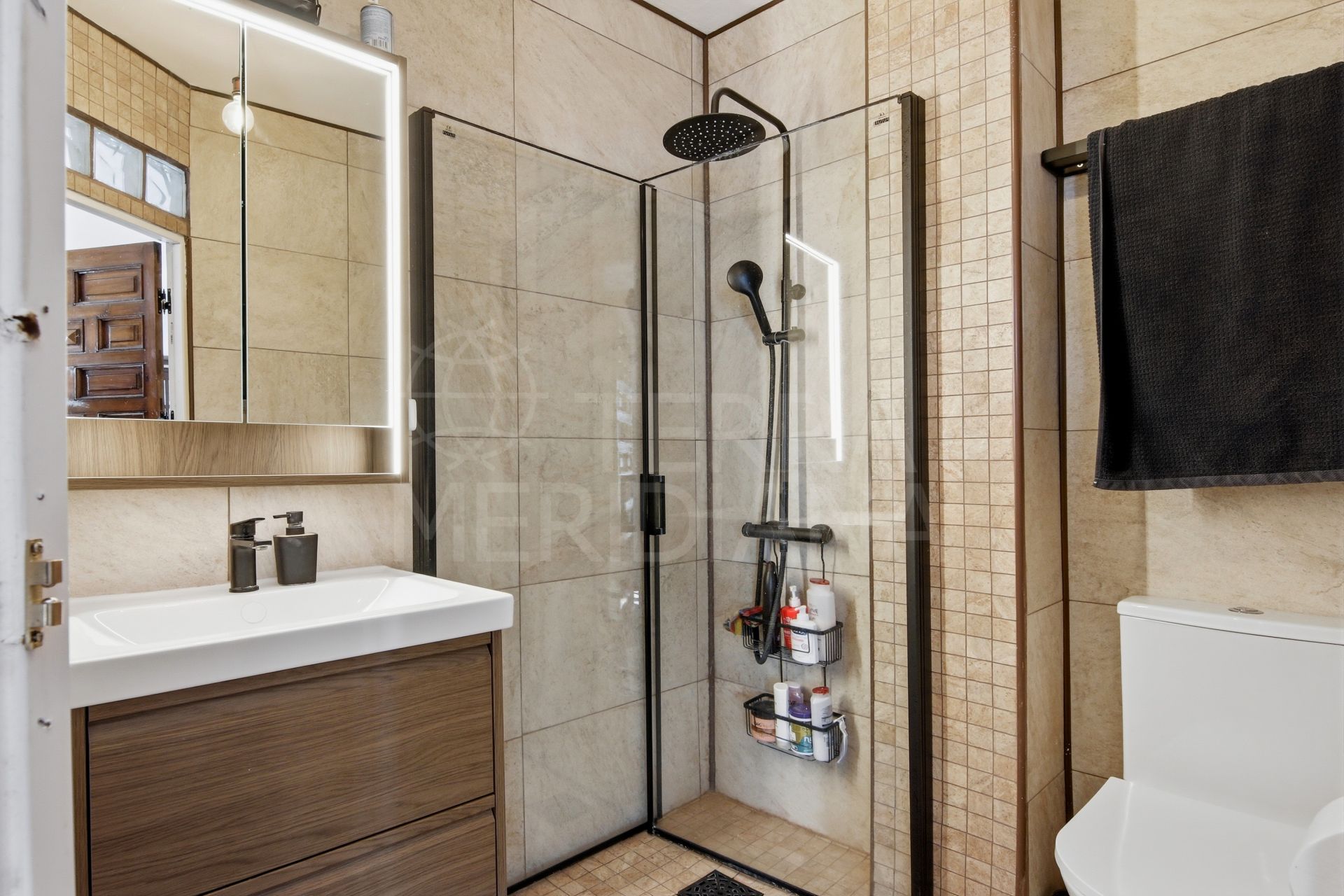 The top floor offers an additional room that can serve as a bedroom or flexible space, with direct access to a private solarium terrace. Generous in size, the terrace is ideal for outdoor dining or unwinding in the sun, with views stretching across the rooftops of the old town and also of the Sierra Bermeja mountains.