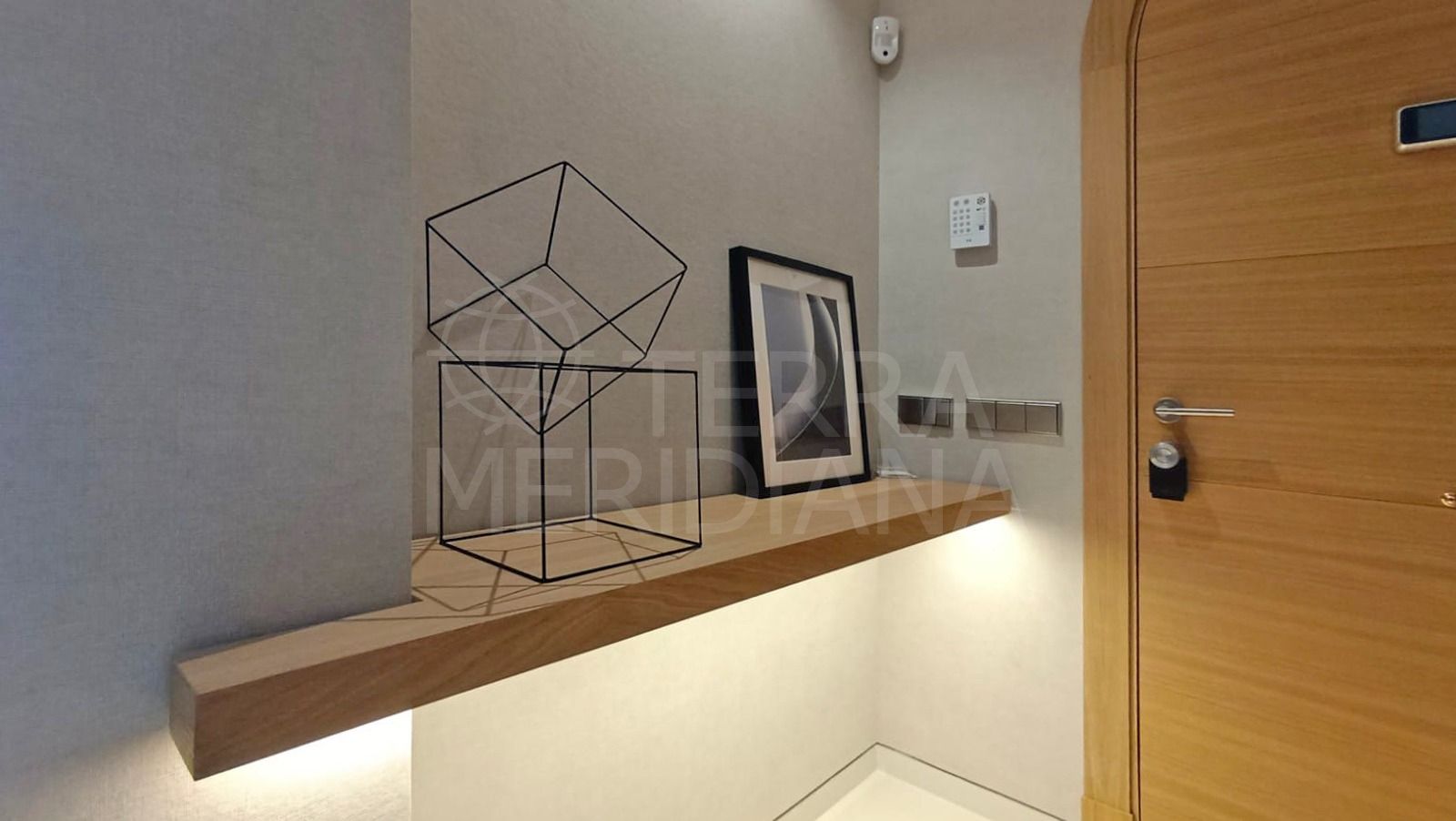Inside, the property is thoughtfully designed around a spacious and light-filled living room, where expansive floor-to-ceiling glazing opens directly onto the terrace, enhancing the connection between indoor and outdoor living. The open-plan kitchen features a central island and sleek, fully integrated contemporary appliances, creating a functional yet stylish space that combines cooking, dining, and socialising in one cohesive layout.