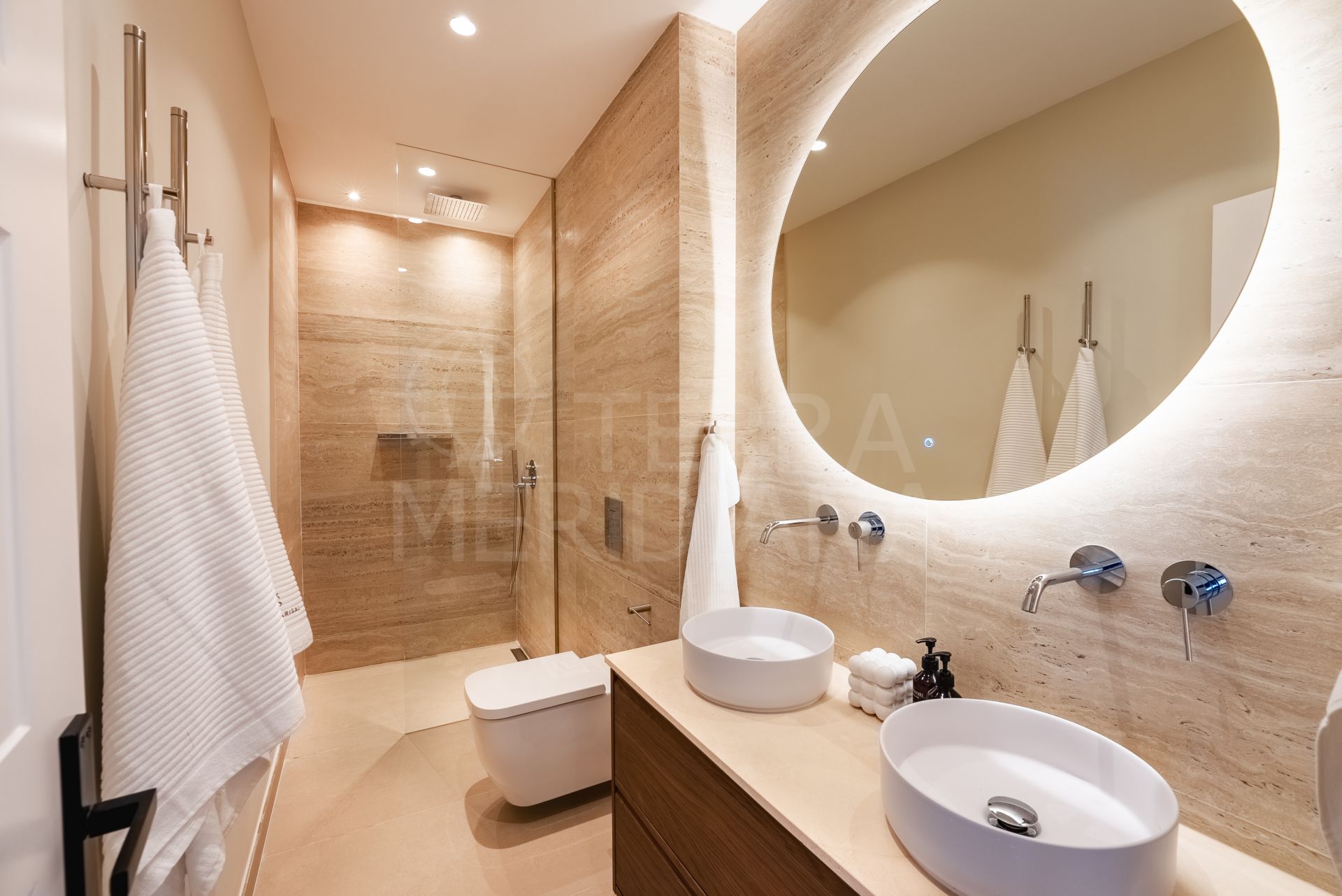 The residence offers five bedrooms and five bathrooms. The primary suite occupies a private first-floor wing with its own terrace and a marble and travertine bathroom featuring underfloor heating. A second primary suite on the upper level enjoys rooftop access, where a sky lounge with a jacuzzi captures panoramic views of La Concha and the coastline.