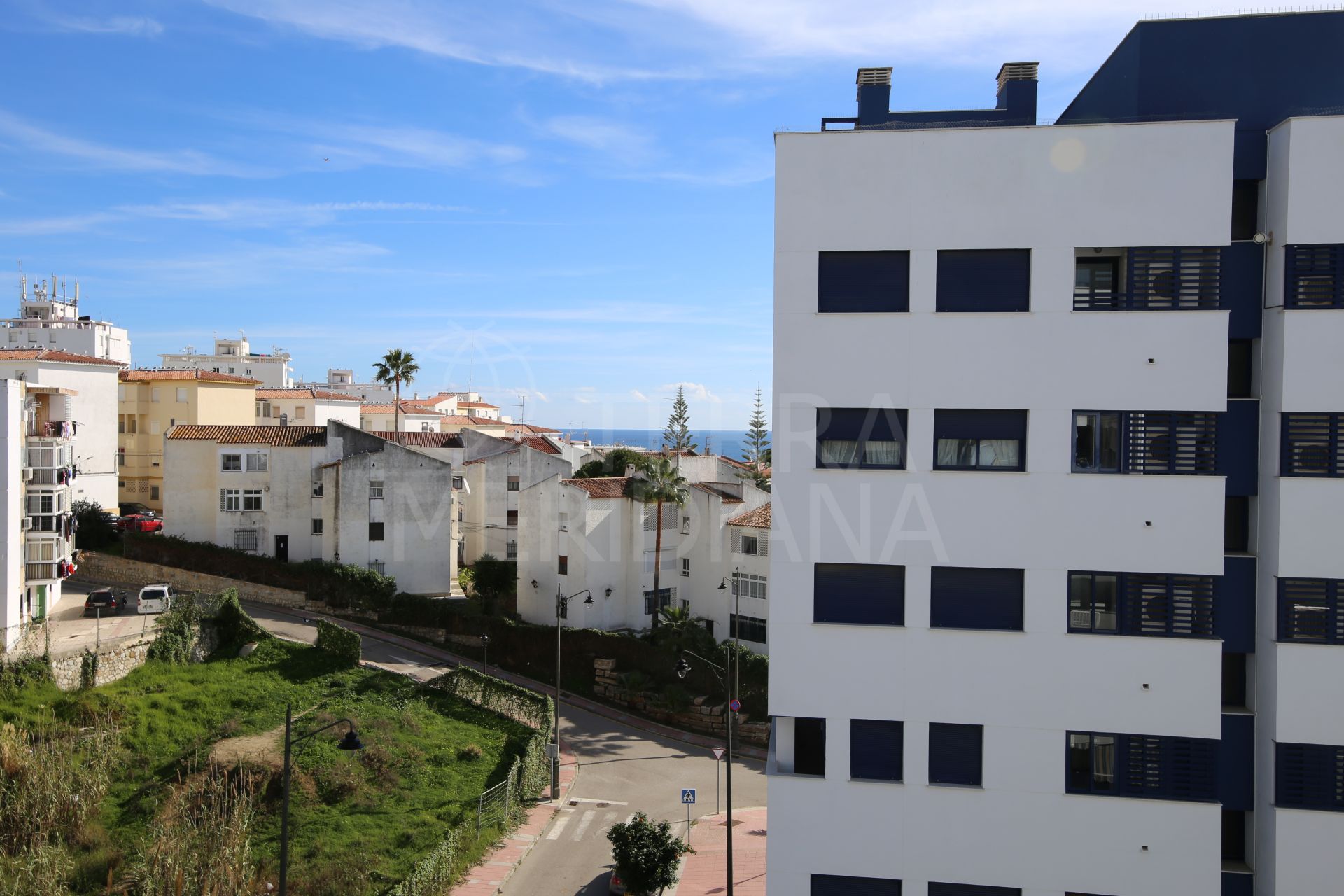 "Стильная трехкомнатная квартира в центре Эстепоны, всего в нескольких шагах от пляжа и порта, с видом на море, солнечной террасой и курортной инфраструктурой."