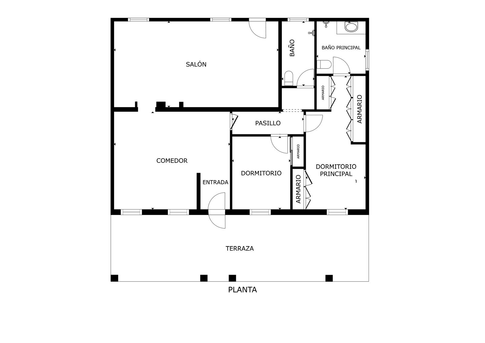 Приближаясь к дому, вы попадаете на просторную крытую веранду, задающую тон всему дому. Вход осуществляется через гостиную, из которой открывается доступ к двум спальням справа. Первая — гостевая спальня, напротив которой удобно расположен полноценный санузел. Далее следует основная спальня с собственной ванной комнатой и вместительными встроенными шкафами, обеспечивающими большое количество мест для хранения.