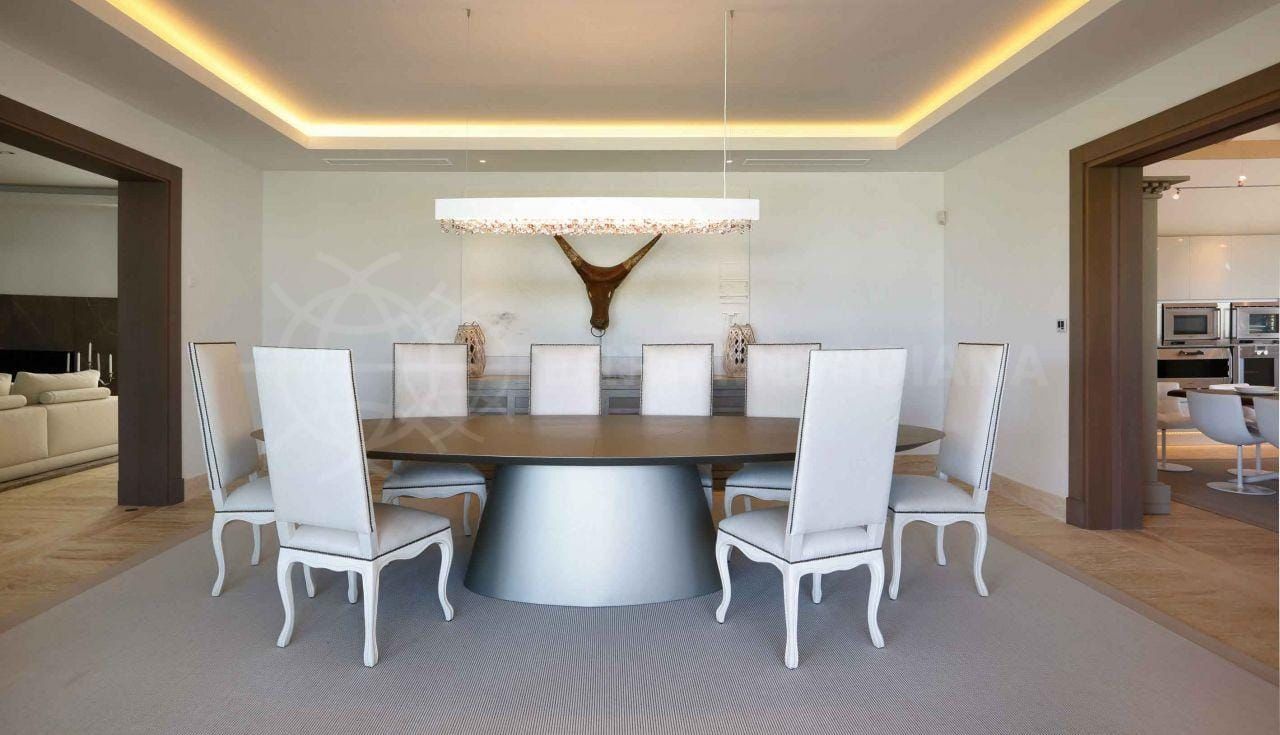 В планировке виллы используется классическая и современная андалузская архитектура для создания элегантного жилья, где традиционные элементы наружного дизайна, такие как фонтаны, патио и просторные крытые и закрытые террасы сочетаются со светлыми внутренними пространствами с полноразмерными стеклянными стенами, несколькими гостиными, современной островной кухней, шестью спальнями, спортзалом, домашним кинотеатром, комнатой для игр и крытым и открытым бассейнами.